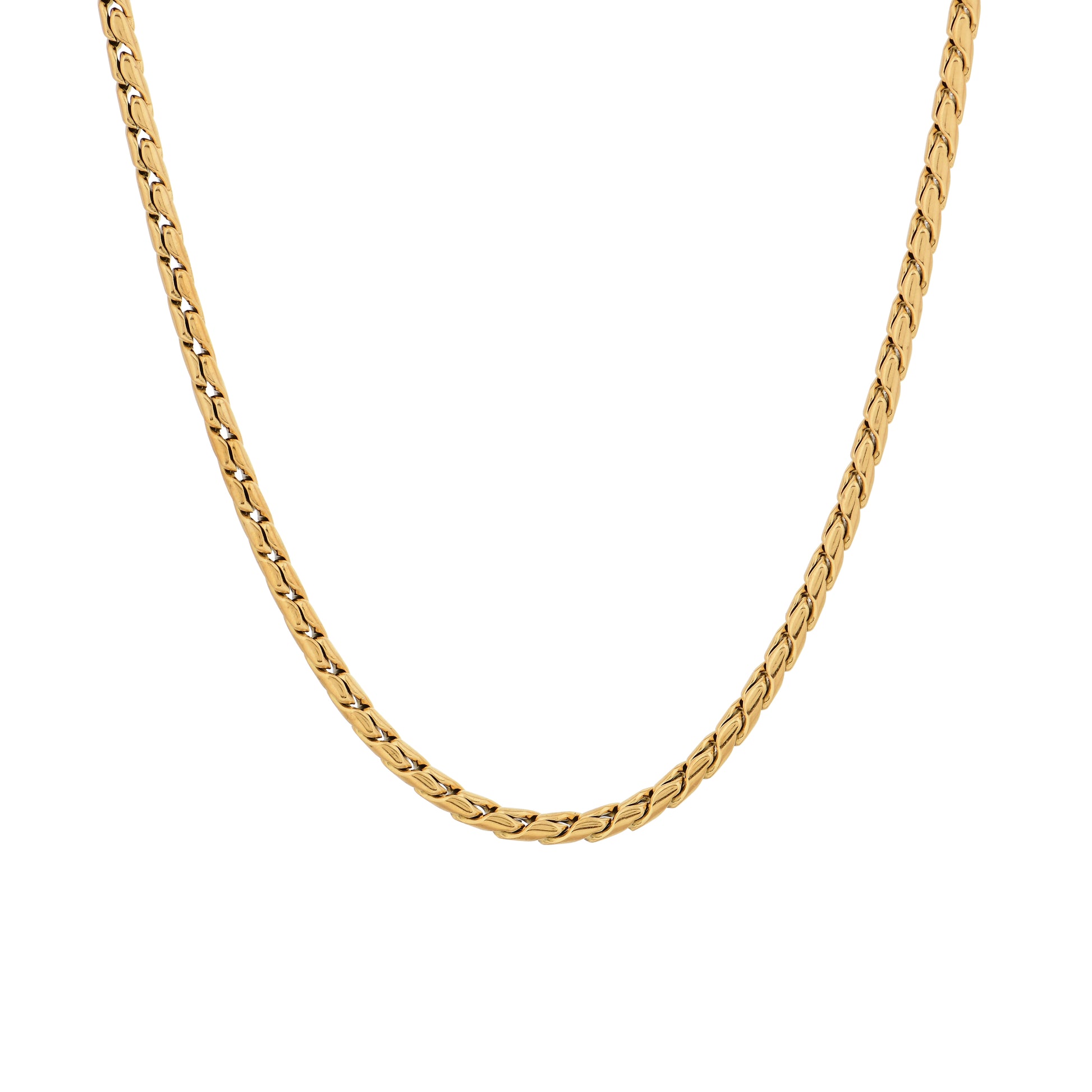 - Expertly crafted from high-quality stainless steel, this 22-inch chain features a wheat-style interlocking pattern, giving it a distinct texture and a refined, masculine look. The gold plating provides a radiant mirror-like finish that instantly elevates your outfit. Built to last, it’s anti-tarnish, waterproof, and skin-friendly, ensuring durability and comfort with every wear.